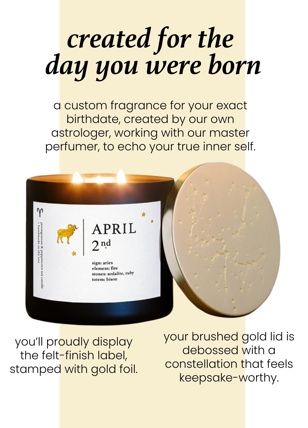 The Cosmic Birthday Candle pairs a custom fragrance with a birthdate-specific astrology reading, researched and written by our in-house astrologer, Diego.
