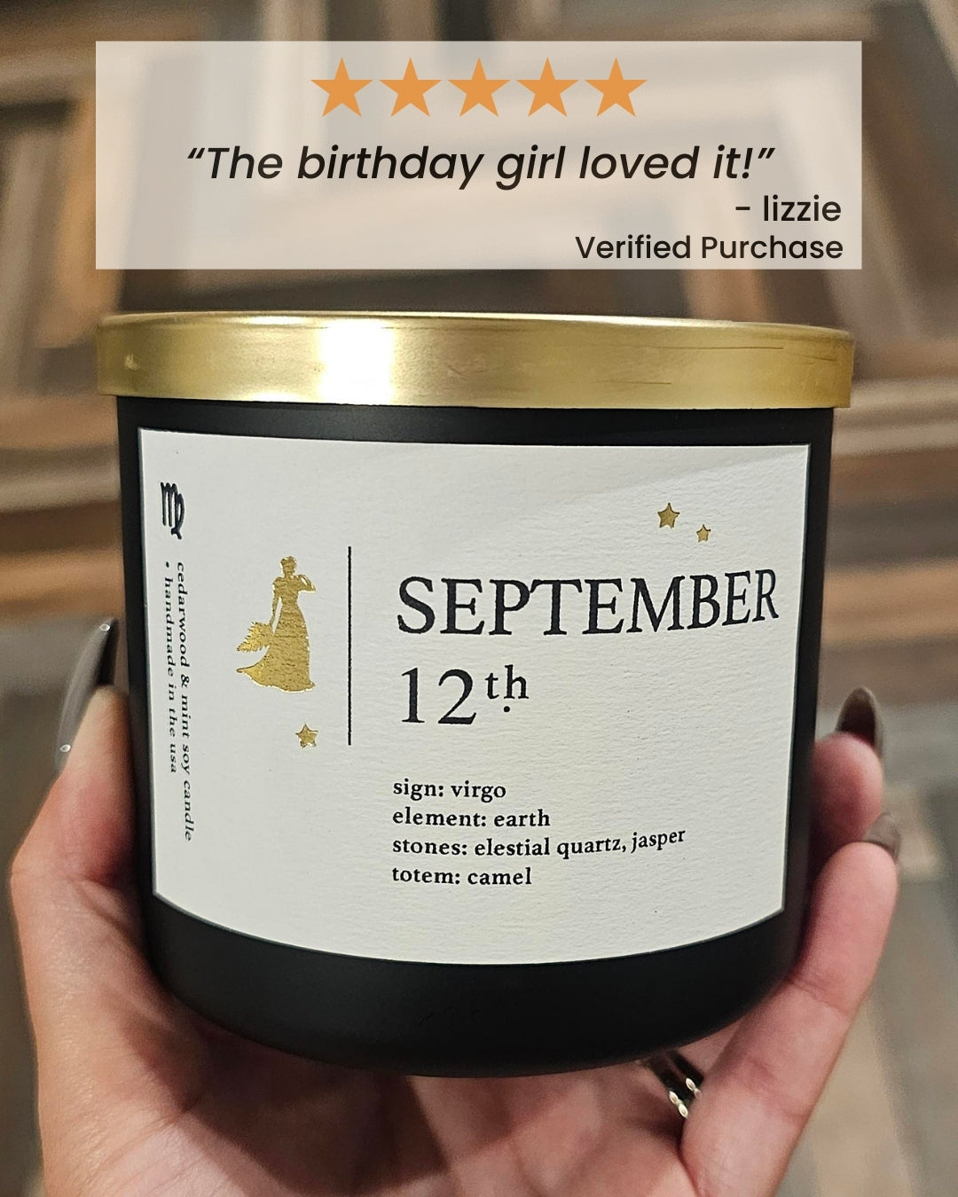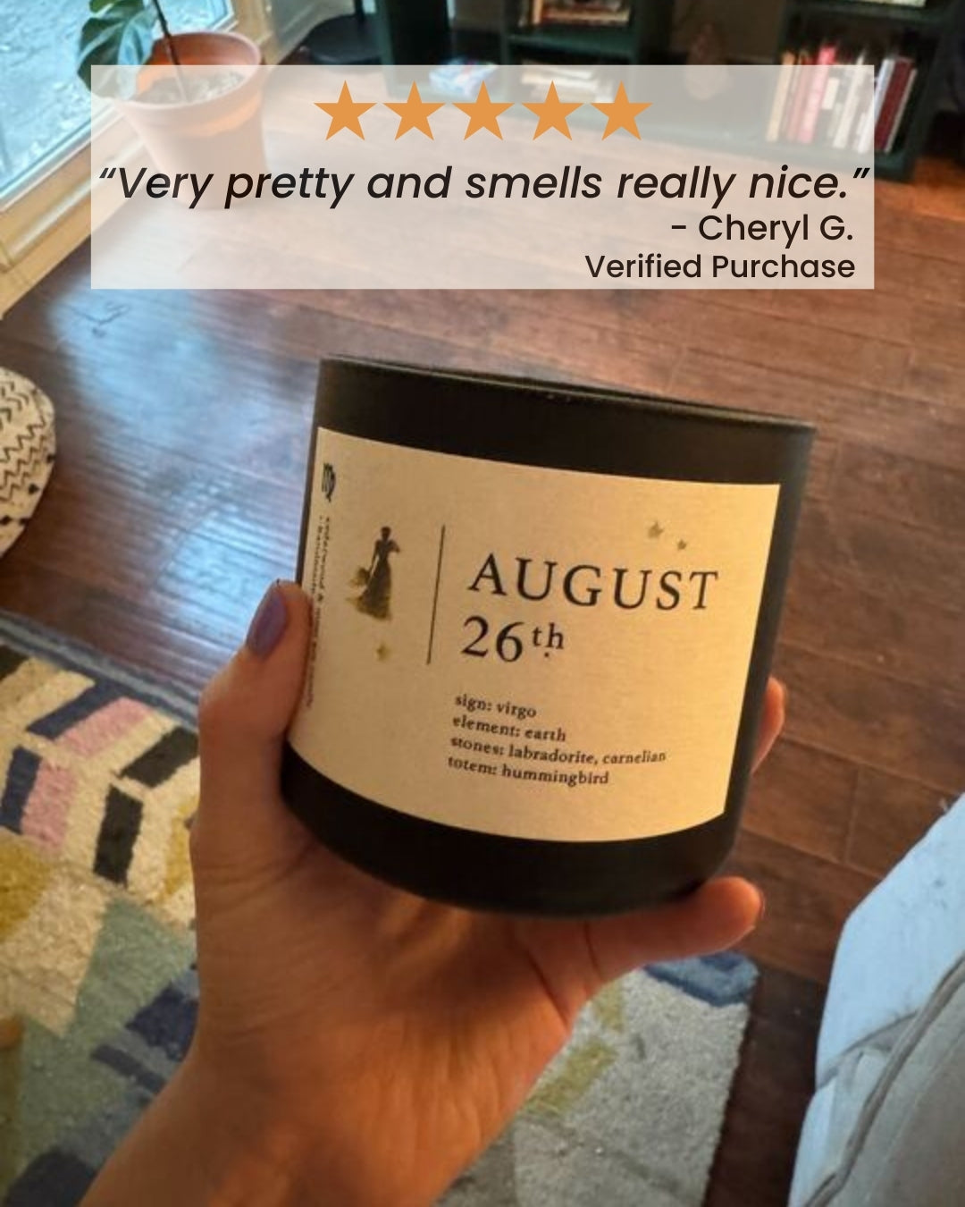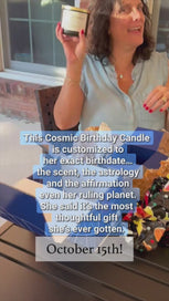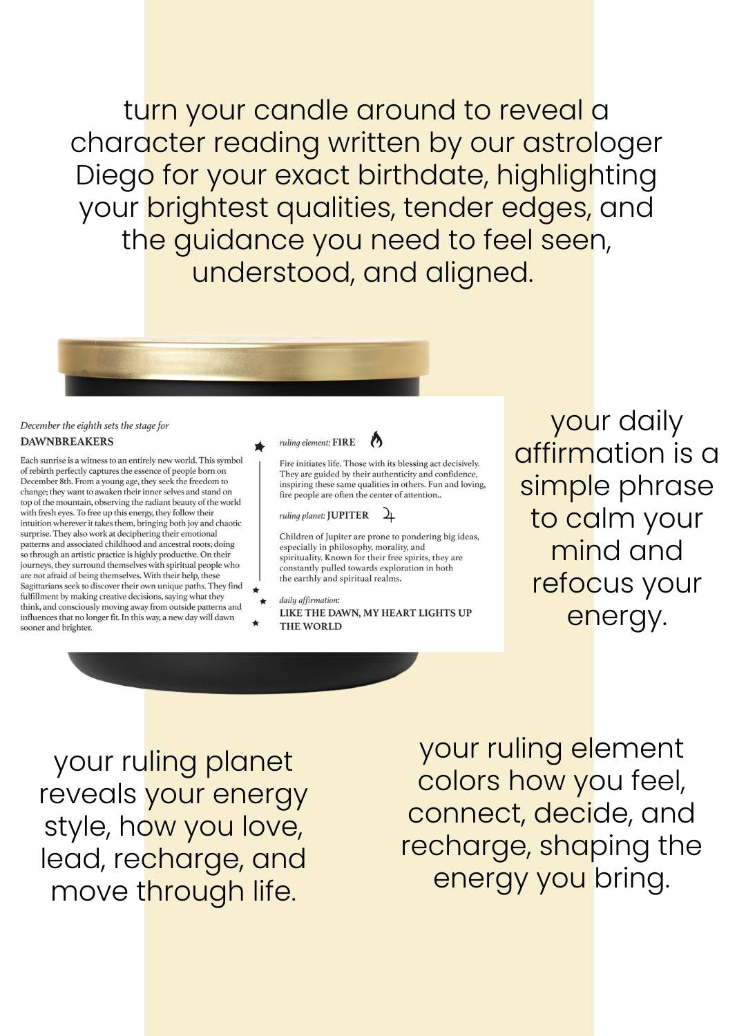 Each Cosmic Birthday Candle is handcrafted in the USA and personalized for your exact birthdate. Your candle includes a unique fragrance developed to match your exact energy, a daily affirmation, a character reading written by our astrologer Diego, your ruling planet, element, gemstone, and spirit animal, all beautifully presented in a gold-foil stamped gift box.