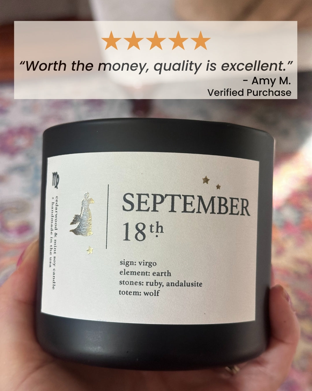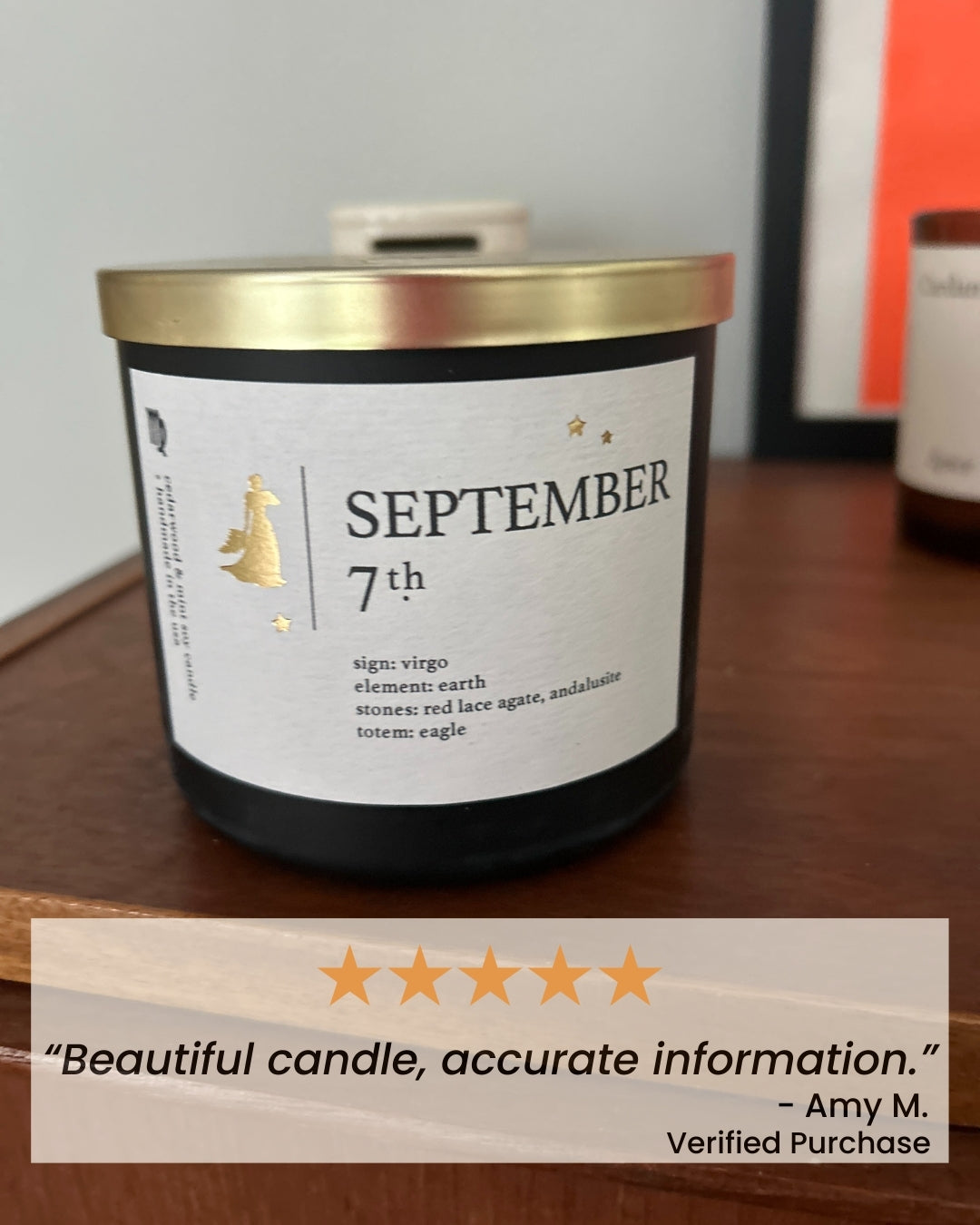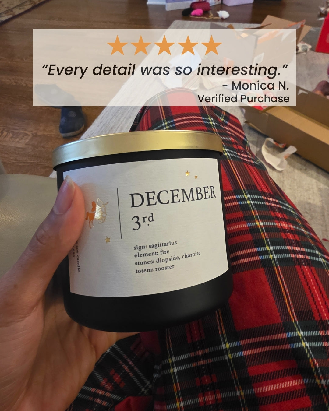 The texts on our candles were researched and written by Diego, our own astrologer, during a two-year spiritual journey across many beautiful and sacred spaces and are crafted to reflect the unique energy of each individual birthdate.