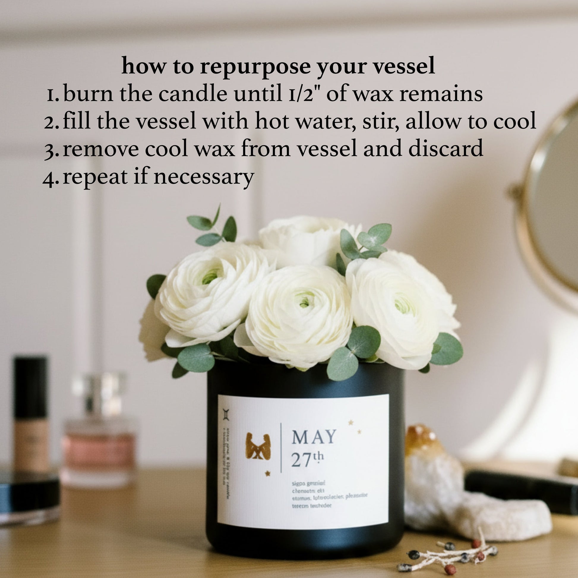 - Stop burning the candle when ½” to ¼” of wax remains