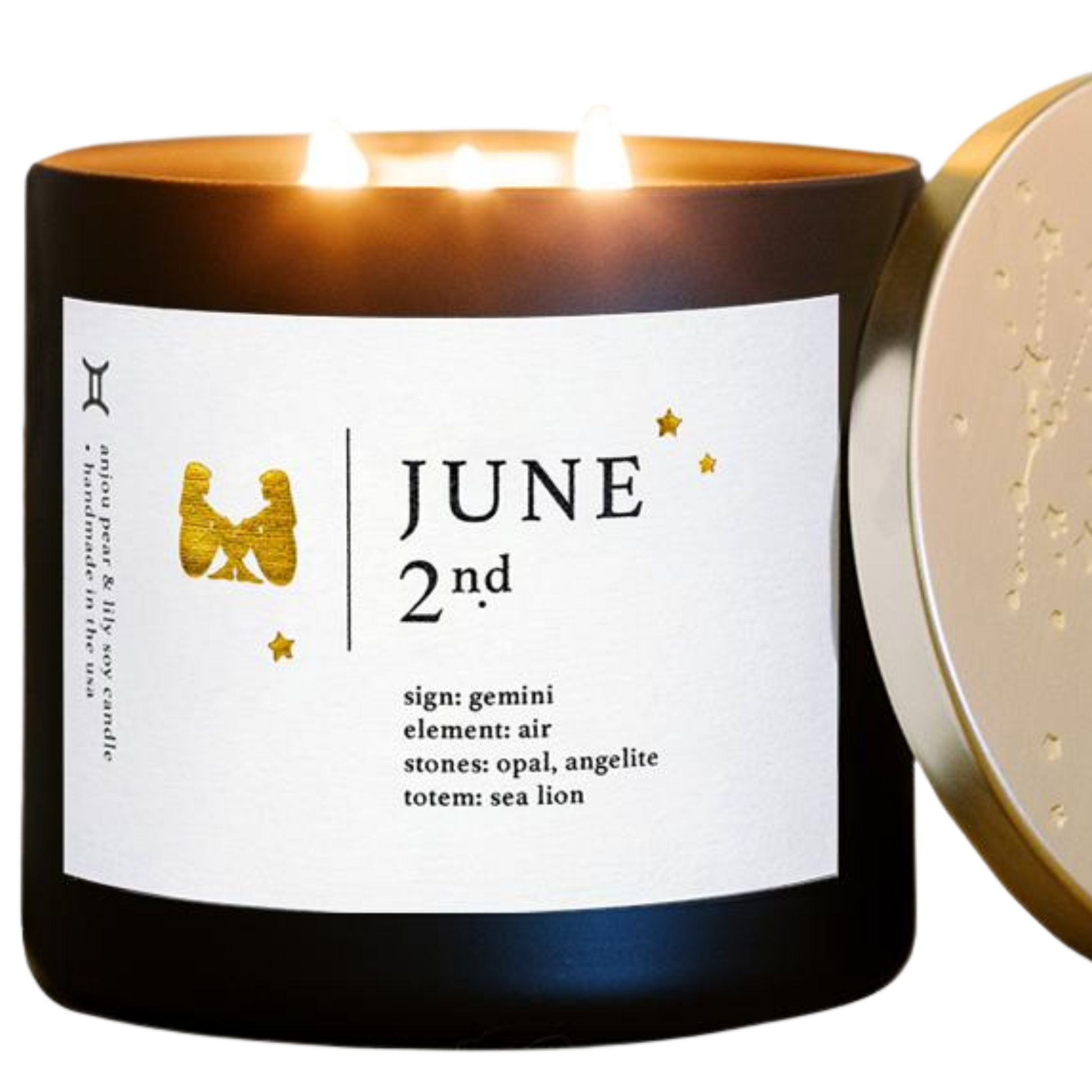 Each Cosmic Birthday Candle is handcrafted in the USA and personalized for your exact birthdate. Your candle includes a unique fragrance developed to match your exact energy, a daily affirmation, a character reading written by our astrologer Diego, your ruling planet, element, gemstone, and spirit animal, all beautifully presented in a gold-foil stamped gift box.